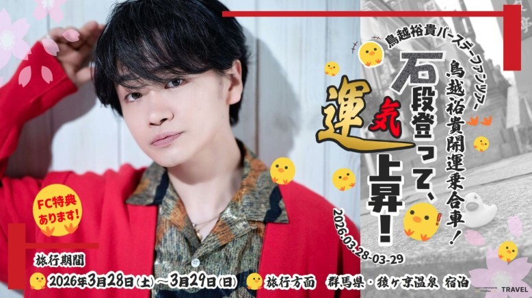 鳥越裕貴バースデーファンツアー『鳥越裕貴開運乗合車!石段登って、運気上昇!』 Schedule 2026/03/28(土) - 2026/03/29(日) 鳥越裕貴バースデーファンツアー『鳥越裕貴開運乗合車!石段登って、運気上昇!』2026年3月28日(土)~3月29日(日)1泊2日詳細はこちら▷▷ URLをコピーする 報告する